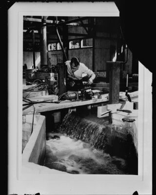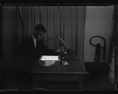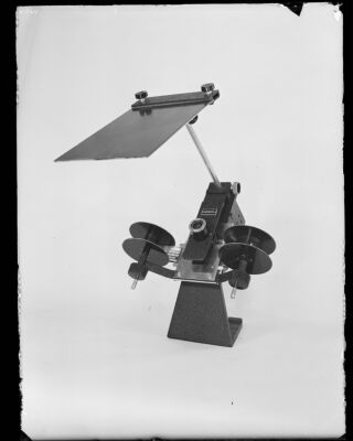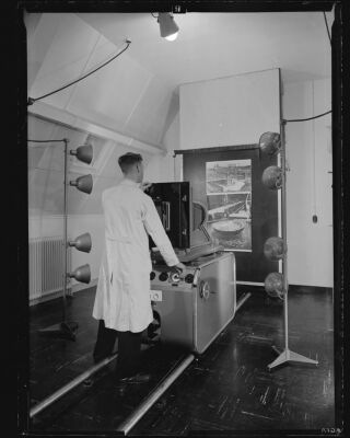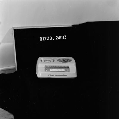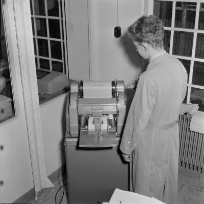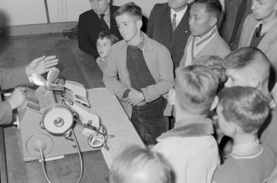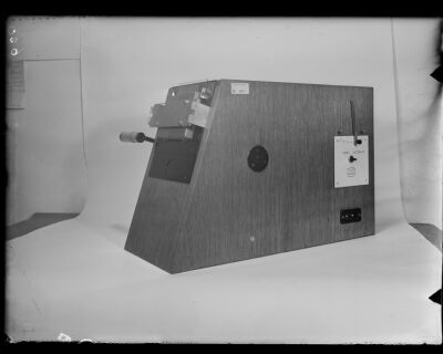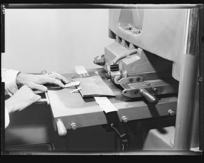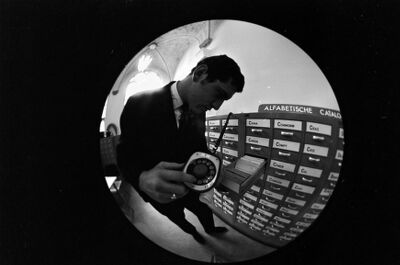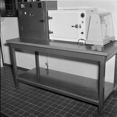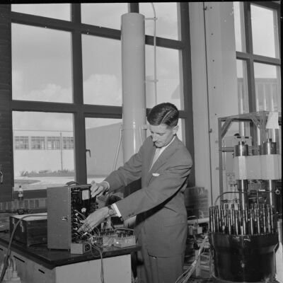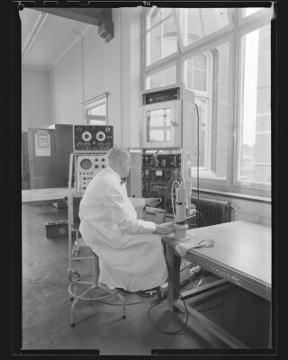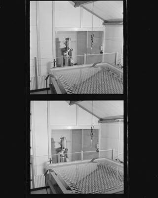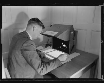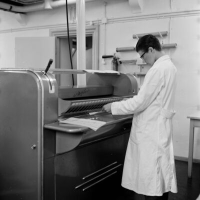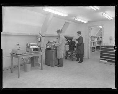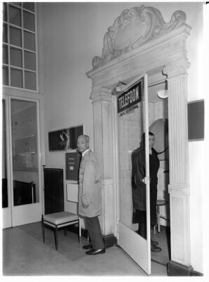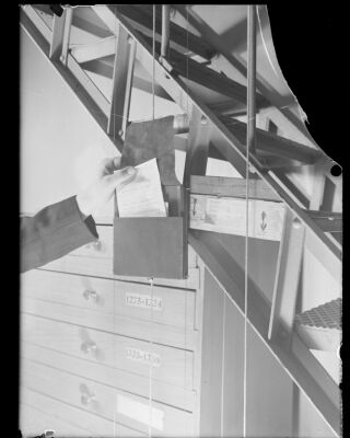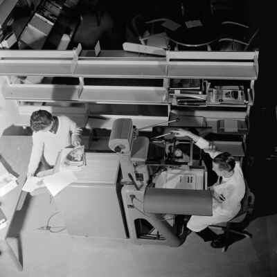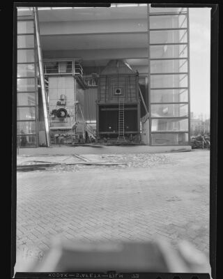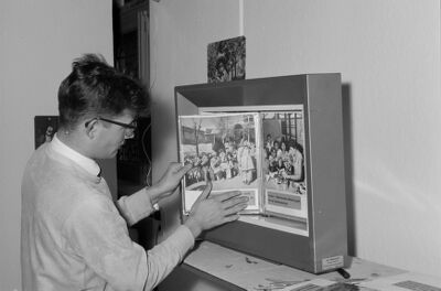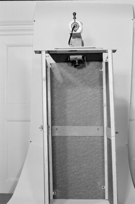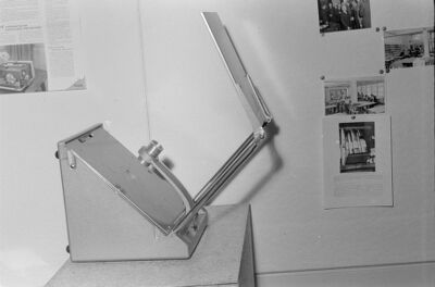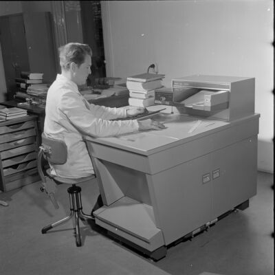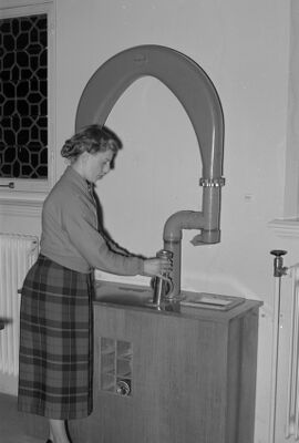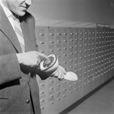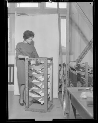 Testen van de wentelgoot, onderdeel van de Bibliofoon, in de bibliotheek van de Technische Hogeschool Delft (2)