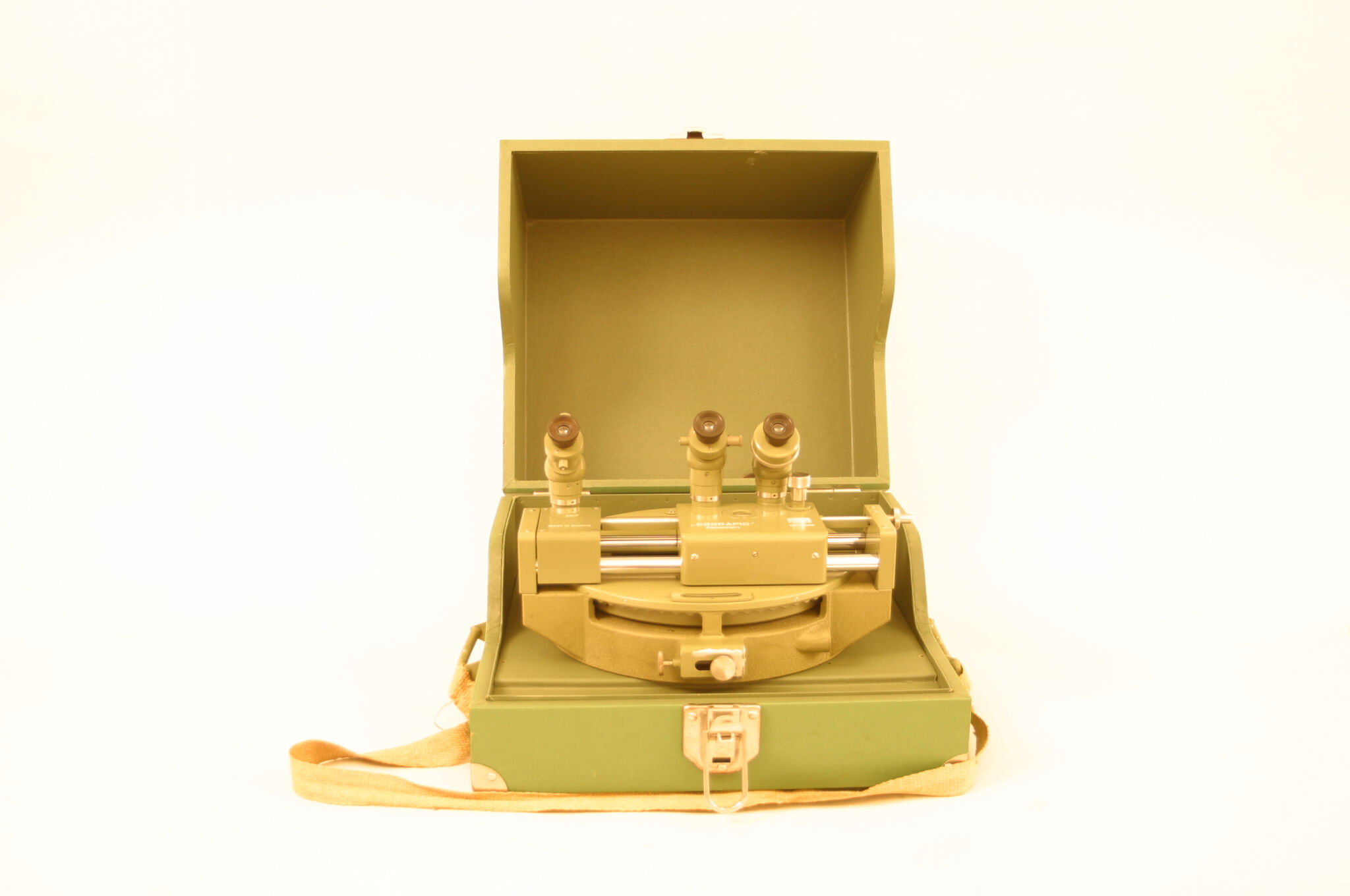 | Description | Mechanische coördinatenberekenaar door Rost in een houten kist. Instrument voor het omzetten van hoekige coördinaten naar poolcoördinaten en omgekeerd. Het instrument heeft een draaibare gradenboog in 400 gon waarop x en y coördinaten zijn verdeeld. De coördinaten worden berekend met behulp van een schaalverdeling die te zien is door een drietal objectieven. Het instrument is voorzien van een gebruiksaanwijzing. |