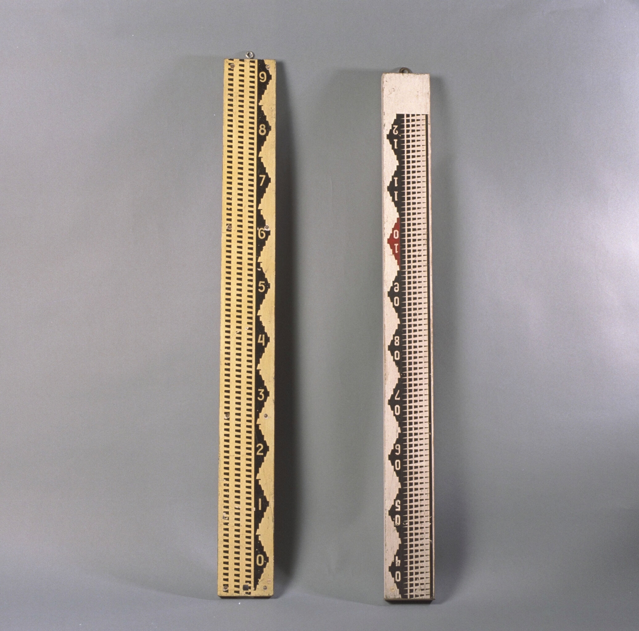 | Description | Hangbaak (onderste op de foto) met transversaalverdeling, naar een ontwerp van hoogleraar Jan Willem Dieperink (1878-1934). De verdeling is aangebracht op een metaal, vermoedelijk invar. Hangbaak t.b.v. nauwkeurigheidswaterpassing (0,1 mm aflezing). Voor gebruik van de hangbaak zie beschrijving van de oude eerste orde NAP merken inventarisnummer 2000.0298.GEO. Geschikt voor alle precisie waterpasinstrumenten zoals 2000.0305.GEO en 2000.0249.GEO. |