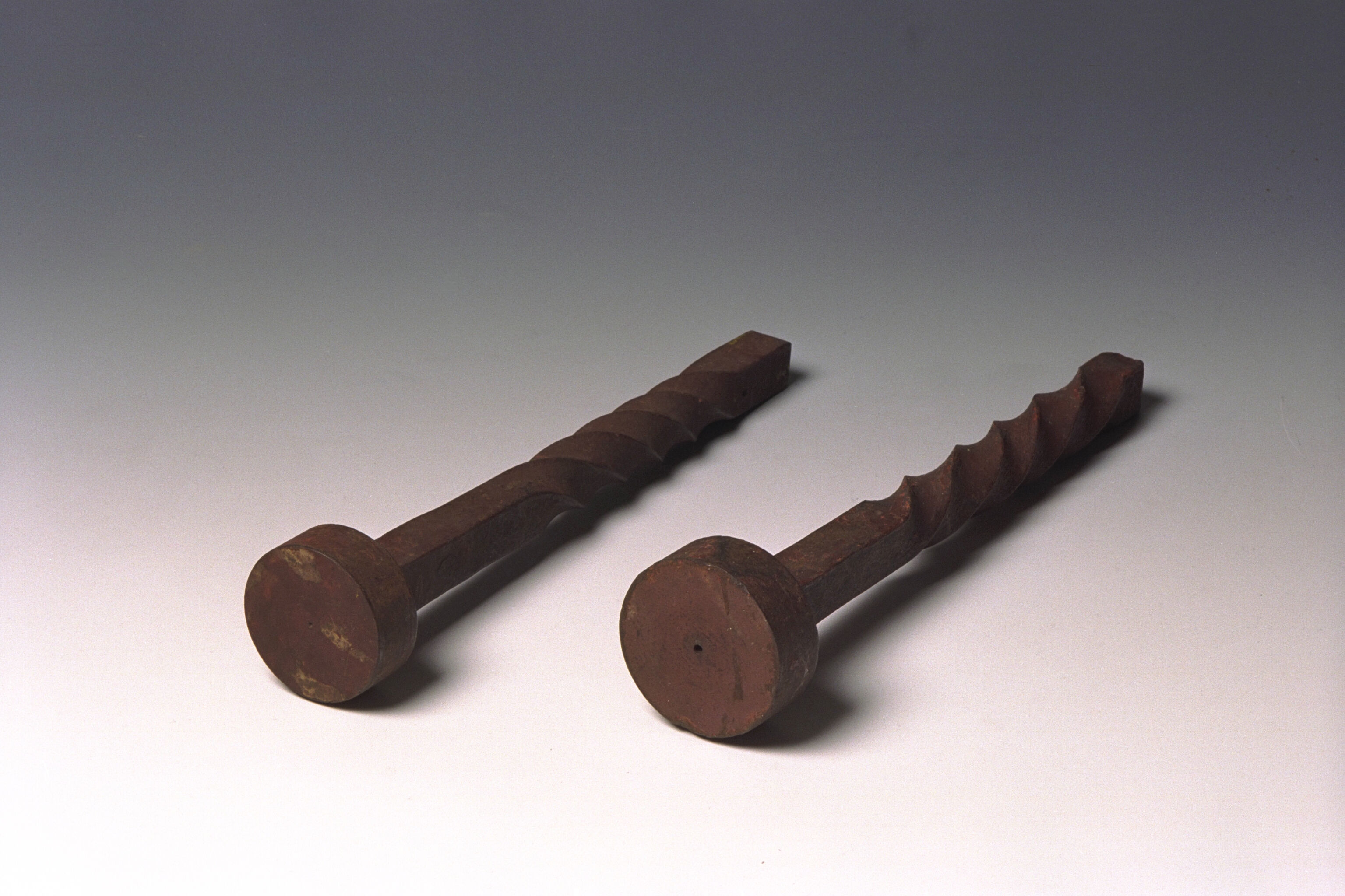 DescriptionTwee vastleggingsbouten zoals gebruikt bij de Rijksdriehoeksmeting in de periode 1886-1926. Voor de vastlegging van bekende punten in en om een in RD bepaalde kerktoren of ander markant hoog gebouw. Zie ook nummer 2000.0822.GEO. Midden in de bout bevindt zich een gaatje.