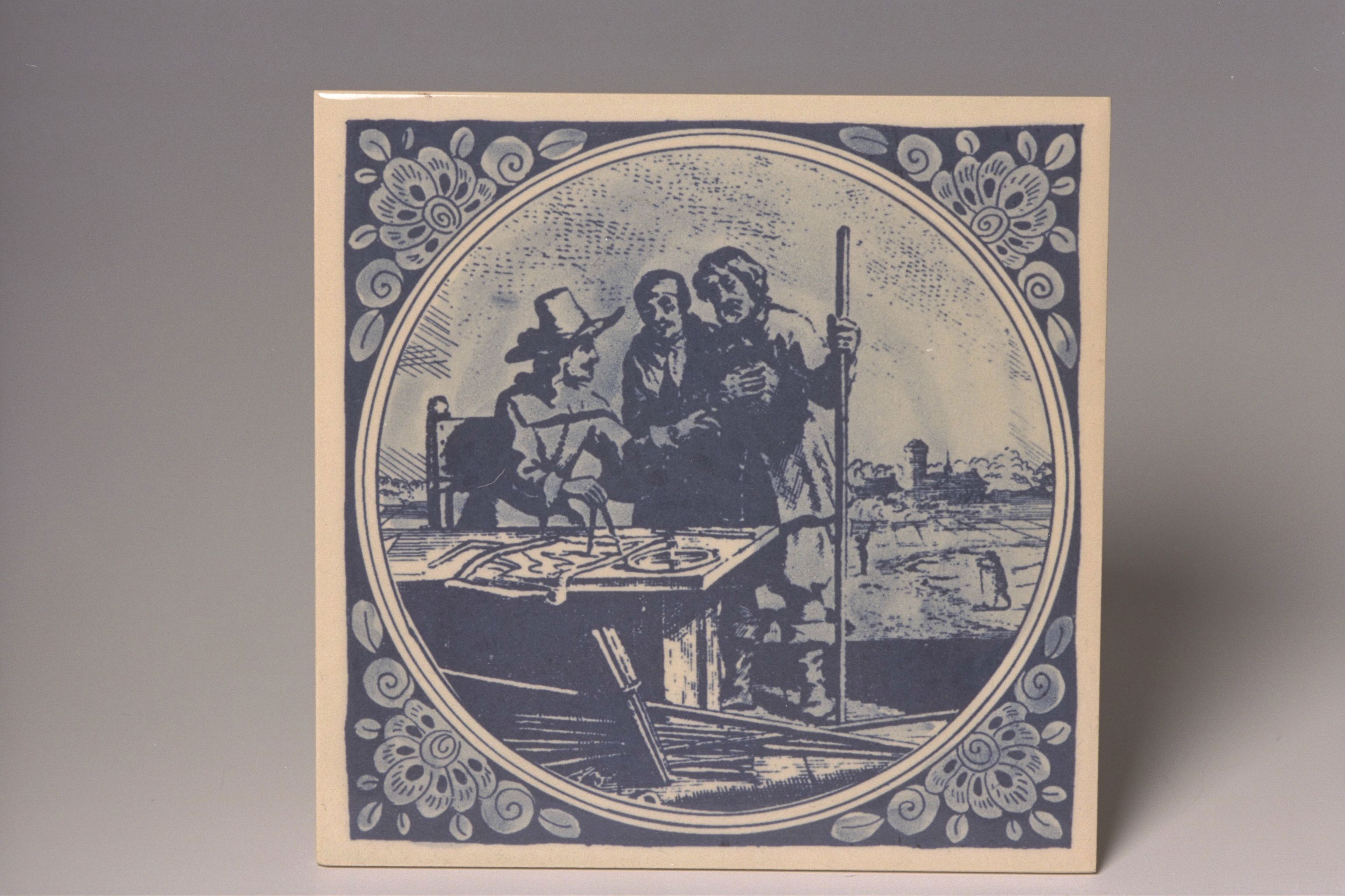 | Description | Een Delftsblauwe gedenktegel die is uitgegeven door de Nederlandse Vereniging voor Geodesie ter gelegenheid van de bijeenkomst van het Permanent Committee van de Fédération Internationale des Géomètres (FIG) in Den Haag op 21 - 24 juni 1962. De tegel is geglazuurd. De afbeelding is naar de titelillustratie van het boek (1662) van Mattheus van Nispen, 'De beknopte Lant-Meet-Konst'. |