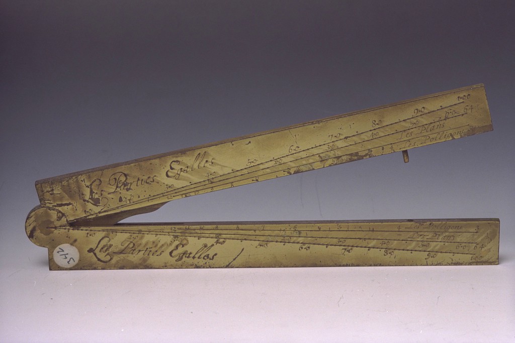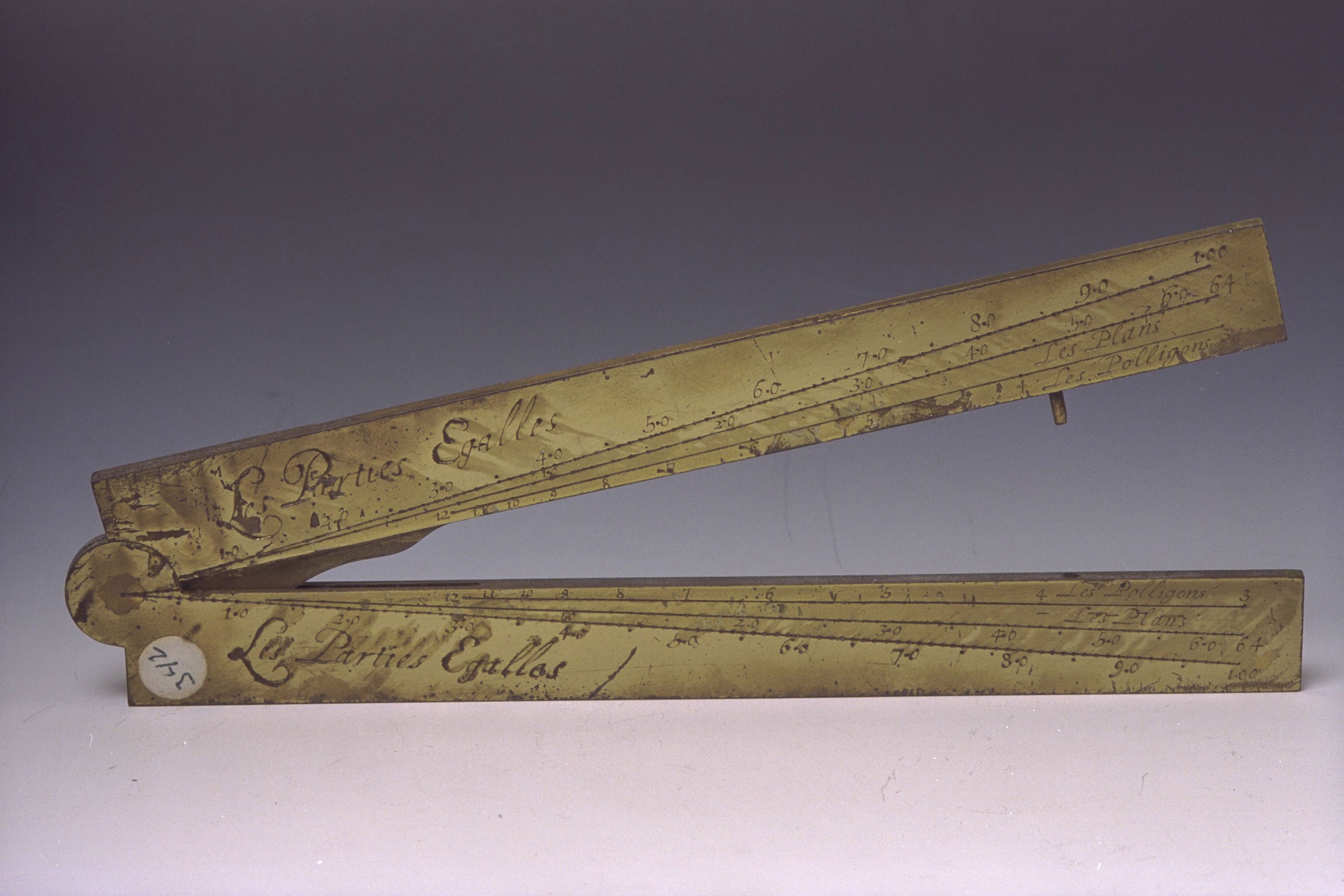 | Description | Rekenhulpmiddel voor het rekenen in een kaart, met een willekeurige schaal. Een proportieliniaal of een proportionaalpasser voorzien van zes dubbele verdelingsschalen, als hulpmiddel bij wiskundige berekeningen en het karteren. De lengte van de benen bedraagt ongeveer zes Parijse duimen. Met een lineaire-, kwadrische-, kubieke-, koorden-, metalen- en polygoonschaal. De koordeschaal is niet correct. De symbolen voor koper en ijzer zijn bij de metalenschaal verwisseld. Aanduidingen zijn in het Frans met veel spelfouten. |