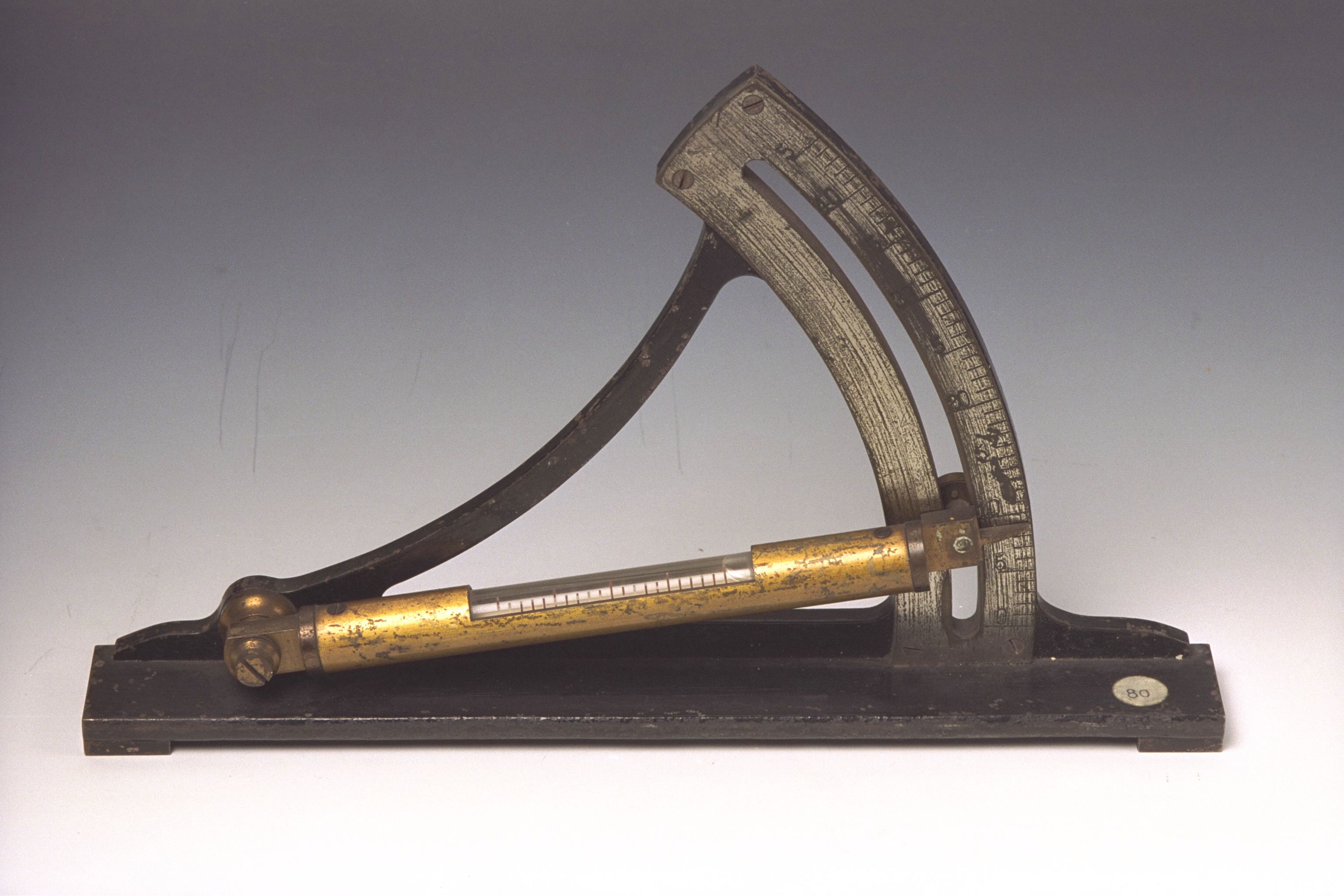 | Description | Hellingmeter, geodetisch meetinstrument t.b.v. lengtemeting met meetstaven vooral bij mijnmetingen. Dit instrument is uitgerust met een gradenboog en een verstelbaar niveau aan een alhidade. Dit instrument werd gebruikt voor de bepaling van de helling van meetstaven en werd vooral toegepast bij mijnmetingen. |