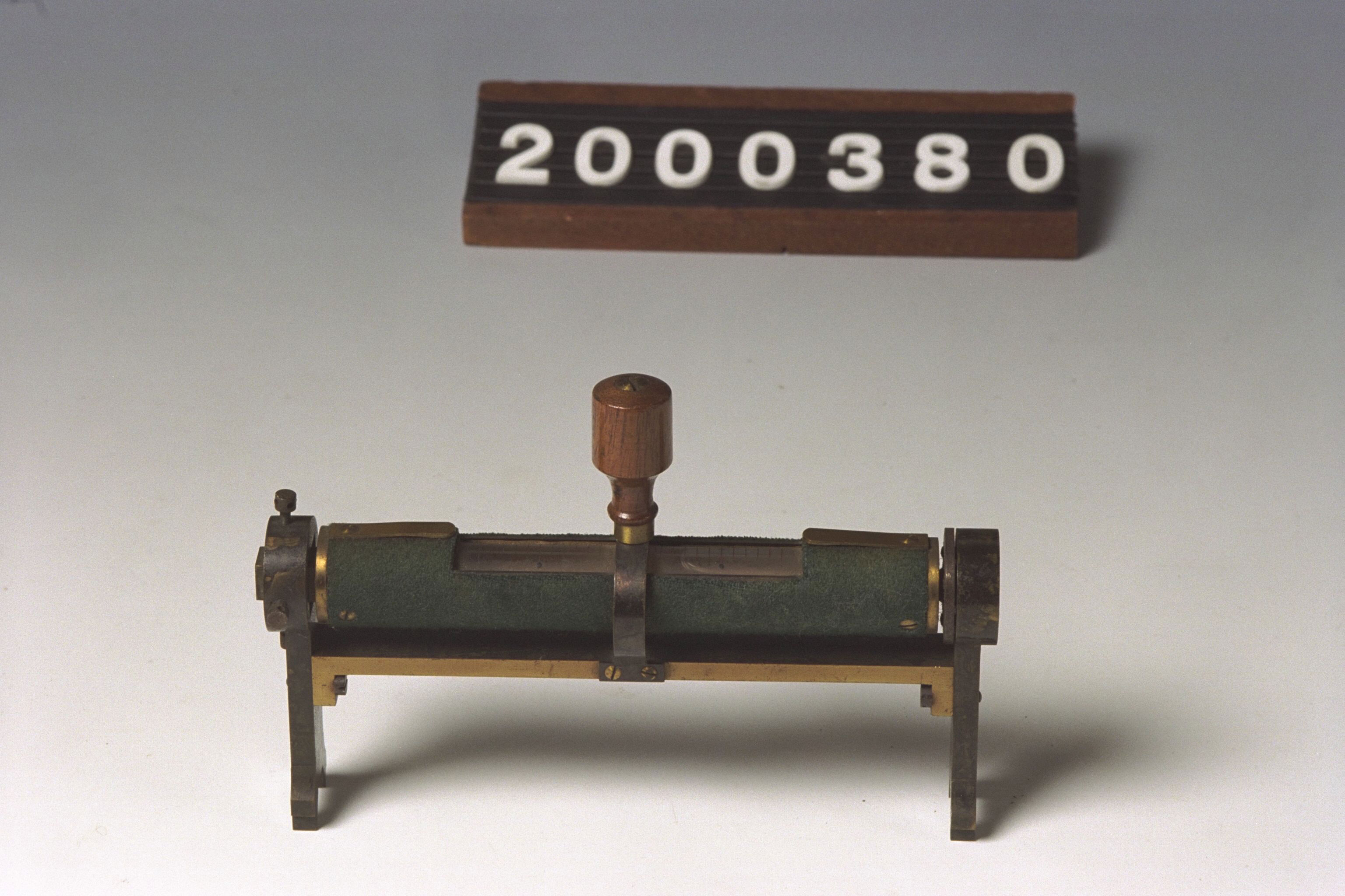 | Description | Ruiterniveau (ook wel alhidadeniveau), hulpmiddel voor horizontaal stellen van de tweede as van een theodoliet, met een houten handvat. |