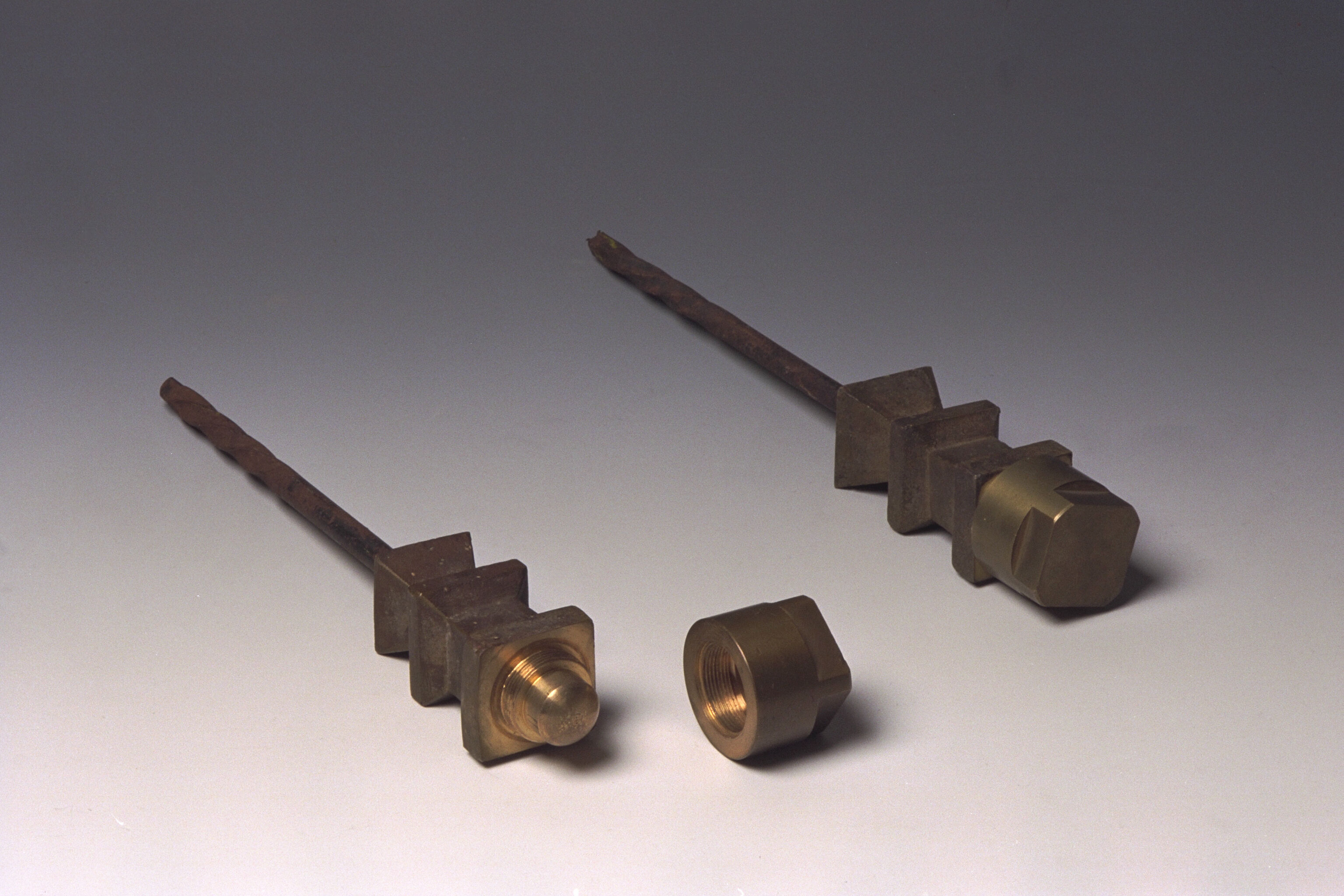 | Description | Vastleggingsbout (NAP bout). Merkteken voorzien van een beschermdop met schroefdraad voor het vaststellen van een ondergronds merkteken voor van de vastlegging van hoogte t.o.v. NAP bij de basismeting in Stroe, 1913. Voor het plaatsen van een ondergronds merkteken in een beton constructie. Zie ook inventarisnummer 2000.0804.GEO. |