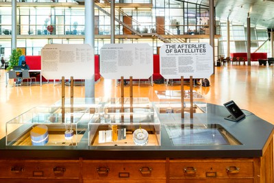 Photos of the "Afterlife of Satellites" exhibition at TU Delft Library