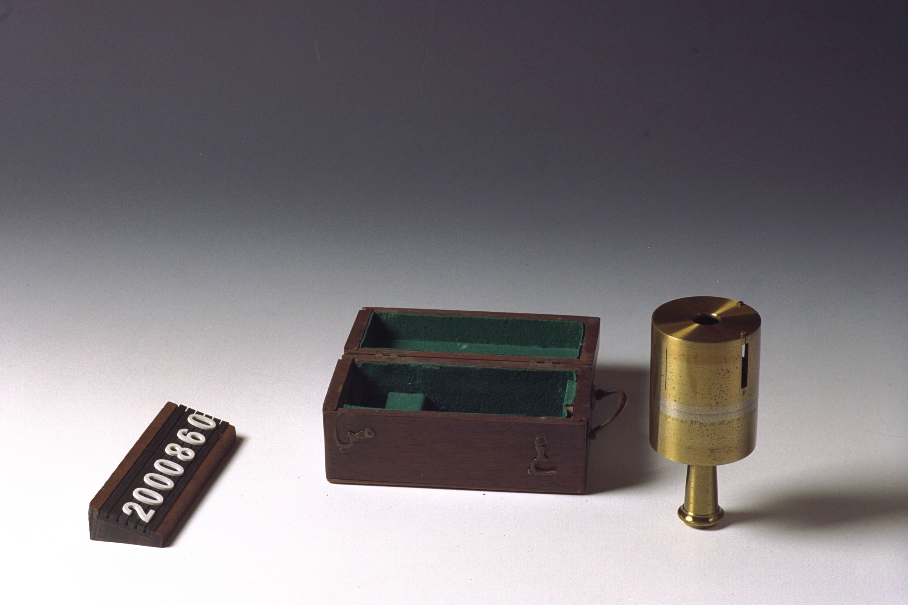 | Beschrijving | Een cilindervormige équerre of pantometer in een met textiel beklede houten kist. Het instrument is voorzien van een gradenboog en een stelschroef waarmee de bovenkant kan worden gedraaid. Het instrument werd gebruikt als hulpmiddel bij richtingmetingen van 0 tot 360 graden. |