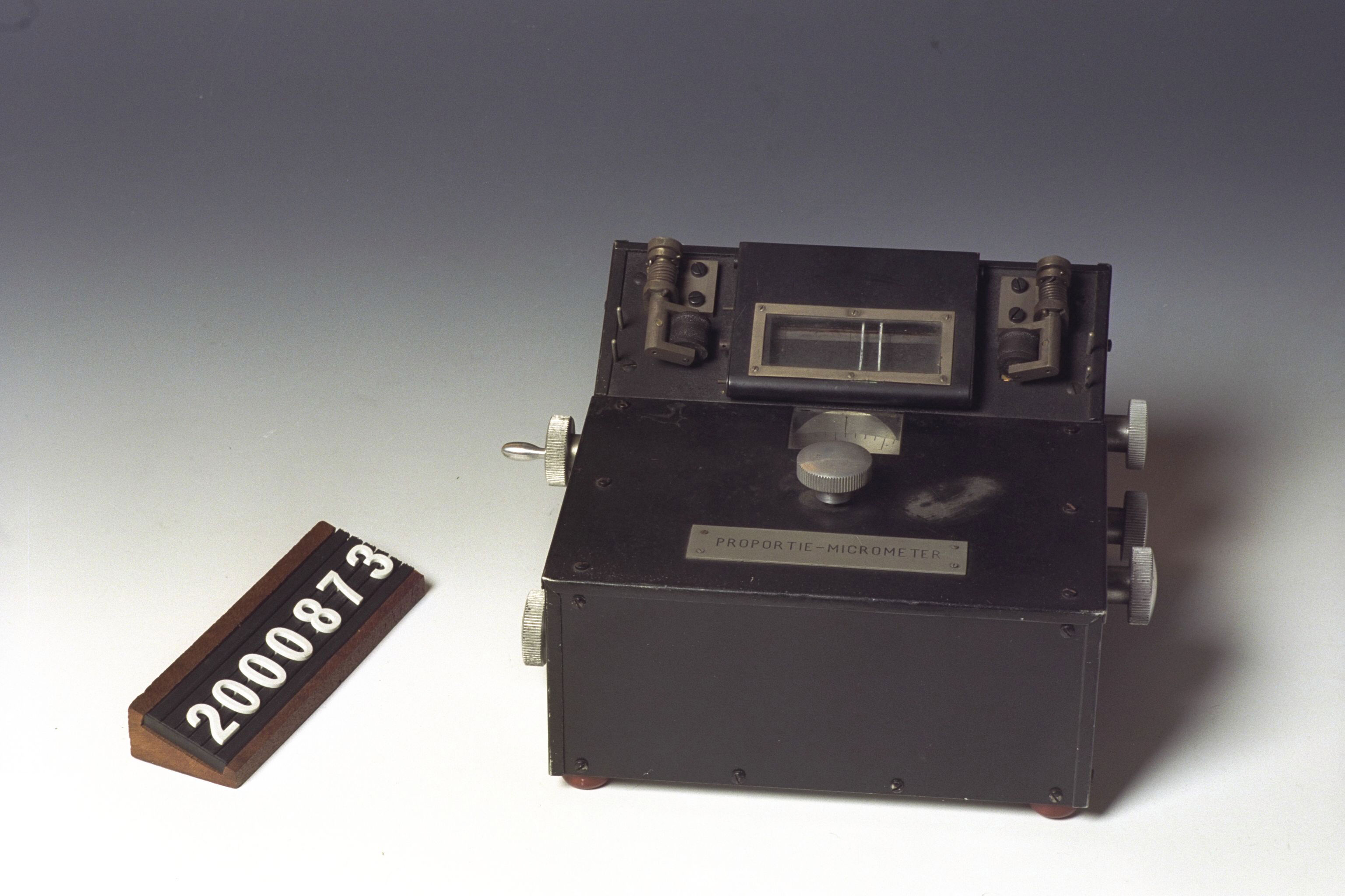 | Beschrijving | Een proportie-micrometer met een draaischijf en twee verstelbare wijzers. Deze micrometer werd gebruikt als oefeninstrument voor het aflezen van diverse randverdelingen van theodolieten. |