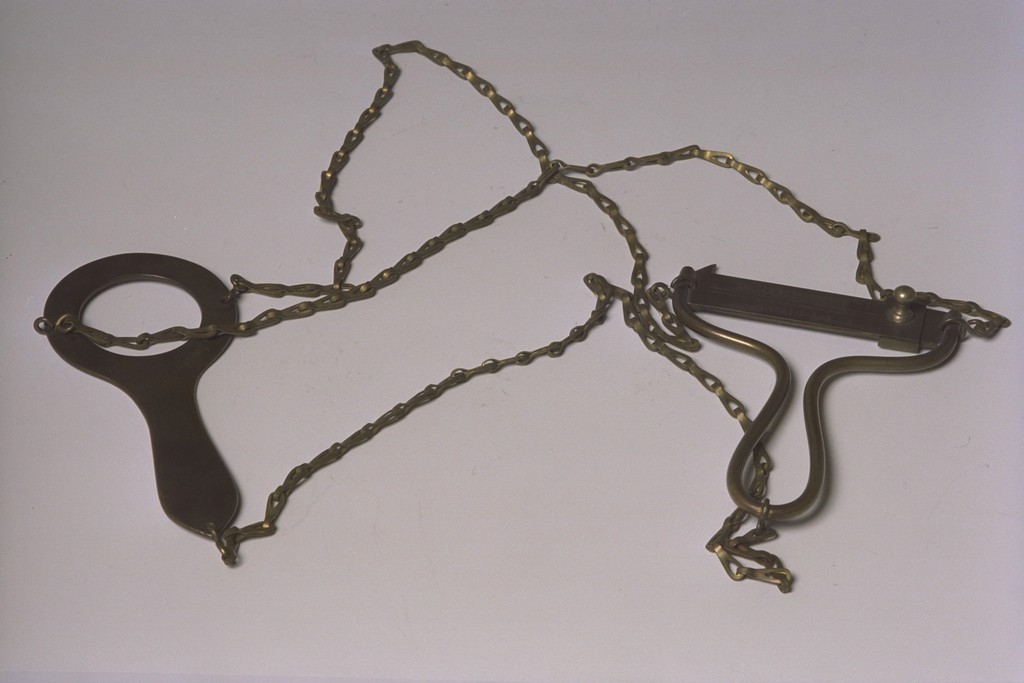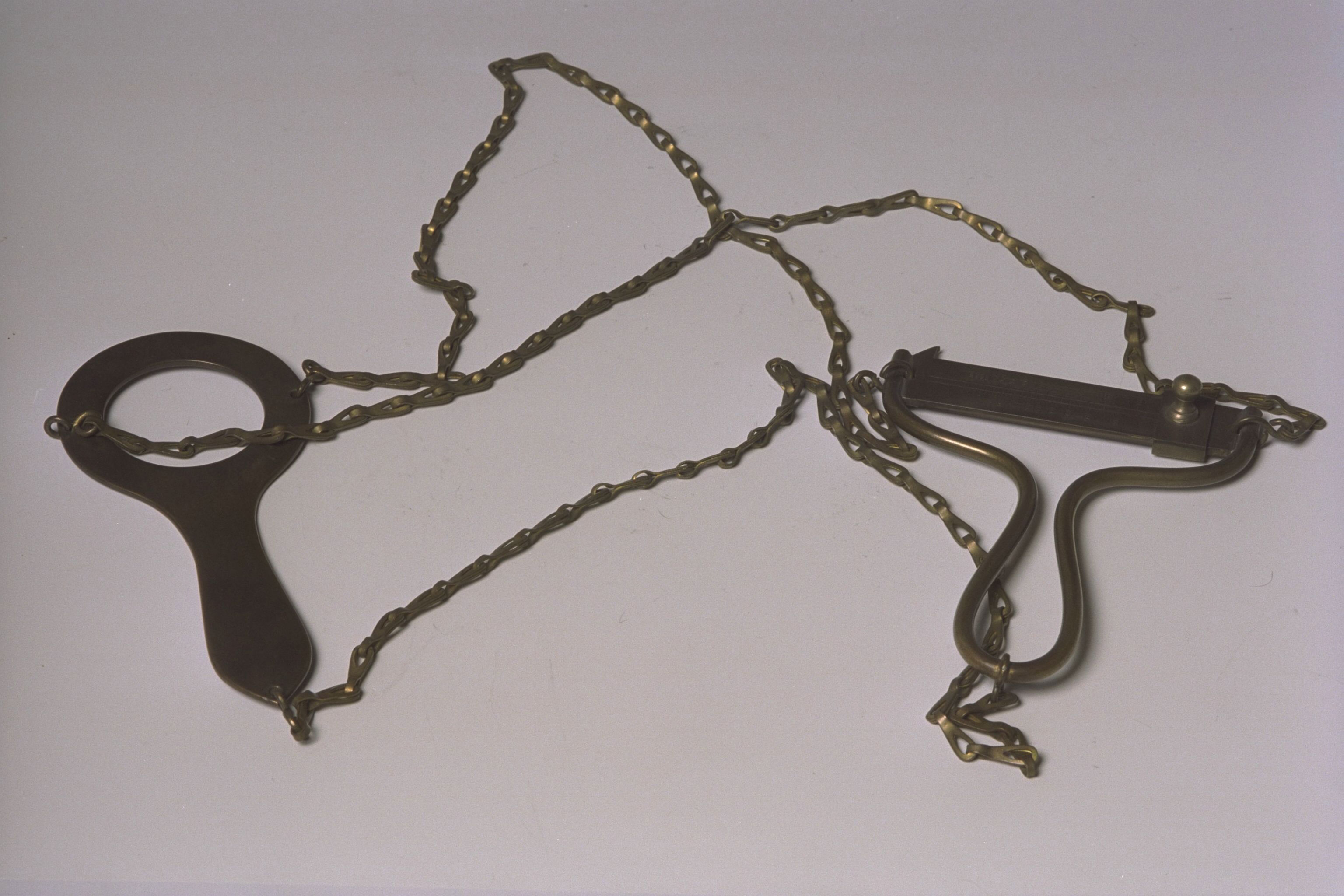 | Beschrijving | Geodetisch meetinstrument voor het bepalen van grote afstanden met geringe nauwkeurigheid, zoals rivierbreedte bepaling. Een simpele afstandmeter, met twee handvatten die door driekettingen bij elkaar gehouden worden. |