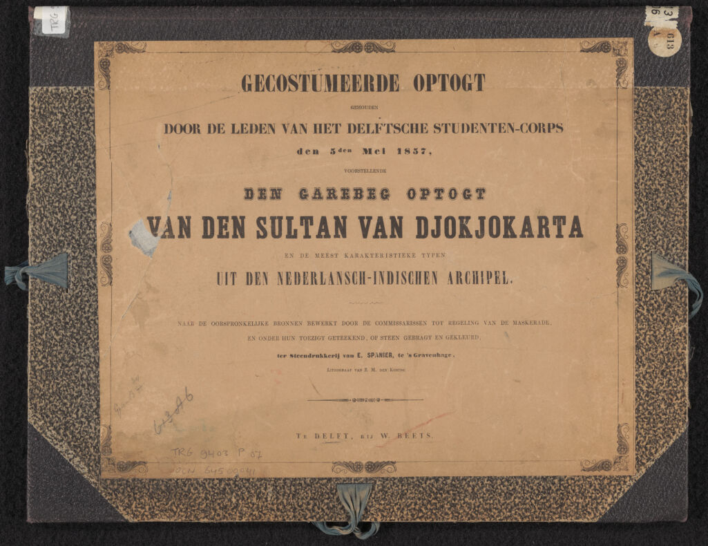 | Title | Gecostumeerde optogt, gehouden door de leden van het Delftsche Studenten-corps den 5den Mei 1857, voorstellende den Garebeg optogt van den Sultan van Djokjokarta en de meest karakteristieke typen uit den Nederlansch-Indischen archipel, naar de oorspronkelijke bronnen door de commissarissen tot regeling van de maskerade, en onder hun toezigt geteekend, op steen gebragt en gekleurd / steendr. van E. Spanier |